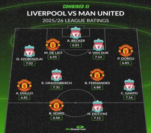 10月19日宣 本轮英超将上演曼联与利物浦的焦点对决,数据网站Whoscored也盘点了两队球员本赛季英超场均评分最高阵容,具体如下: