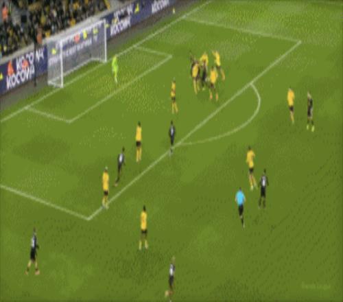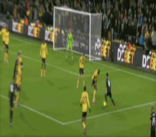 第45+2分钟,沃尔费禁区左侧倒三角传球,贝莱加德中路铲射破门,1-1!狼队扳平。