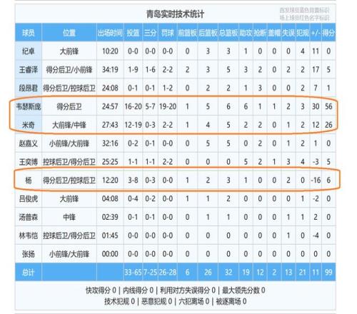 而青岛队全部球员总得分为99分,减去外援88分,本土球员一共就得了11分。外援得分占了全队的89%,本土球员占比为11%。看到这样一组数据,相信很多球迷都是感慨万分!这比赛,完全就是外援的表演赛,似乎与本土球员没有半点关系了。